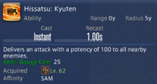 2) Another example of this is the Samurai abilities Hissatsu: Shinten and Hissatsu: Kyuten (Pictured below). The Shinten variant is the single target ability that has a potency of 250. Kyuten is the AOE variant that has a potency of 100. If you only hit 2 targets with the Kyuten ability it will only deal a total of 200 potency when used which does not make it more beneficial than Shinten. However, if you hit 3 or more enemies the potency will then be 300, 400, 500, etc. depending on how many enemies are hit. Kyuten requiring 3 enemies to be hit to have a higher potency would make that ability a “Gain on 3”.