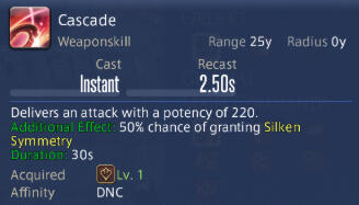 1) One of the easiest examples of this is with the dancer job. The Cascade Weaponskill is the first single target action in a dancers standard 1, 2, 3 attack sequence. As pictured below it will hit only 1 enemy with an attack potency of 220. However, it is paired with the Area of effect (AOE) weaponskill, Windmill, which shares a cooldown.The Windmill weaponskill only hits with a potency of 120, but that is for every enemy hit by it. So if you are able to hit 2 enemies with Windmill that potency then equals 240 which becomes higher than the standard 220 potency from its single target variant. This makes Windmill a “Gain on 2” since hitting only 2 enemies makes it more beneficial than using the single target Cascade.