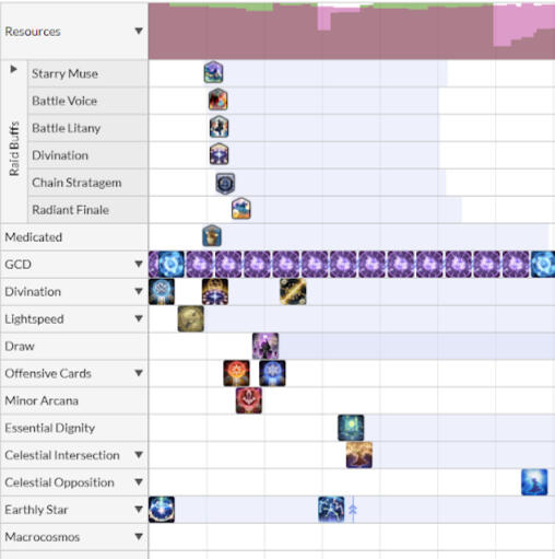A proper 2 minutesWhen a team is able to correctly time their two minutes it delivers a devastating amount of damage onto an encounter and helps push for a team to not get hit by an enraged wall.This is a more simple example of a 2 minute rotation on the GCD side but showcases what correct raid buff timings will look like in a choreographed group. This is the damage chart that goes along with the astros example above.Every mountain is caused by 2 minutes and every dip is the filler in between.What should be put into a 2 minuteA class's biggest cool downs are going to be all used during a 2 minute window. Many classes will store their job gauge or resources in order to put more damage into this buff window. The reason people do this is to shove as much damage as they can while they have all the stacking buffs on top of them. Unlike mitigation, putting everyone buff together is ideal and makes for a much bigger burst window.